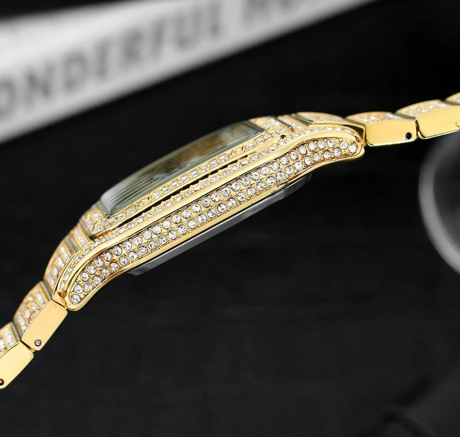 💎 Relógio unissex Quadrado Luxo – Design Exclusivo, Diamantes Decorativos e Mostrador Vazado
