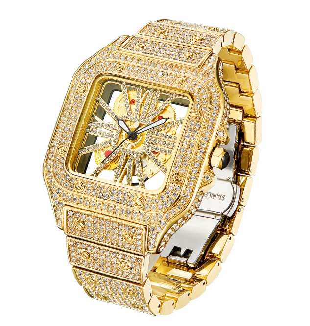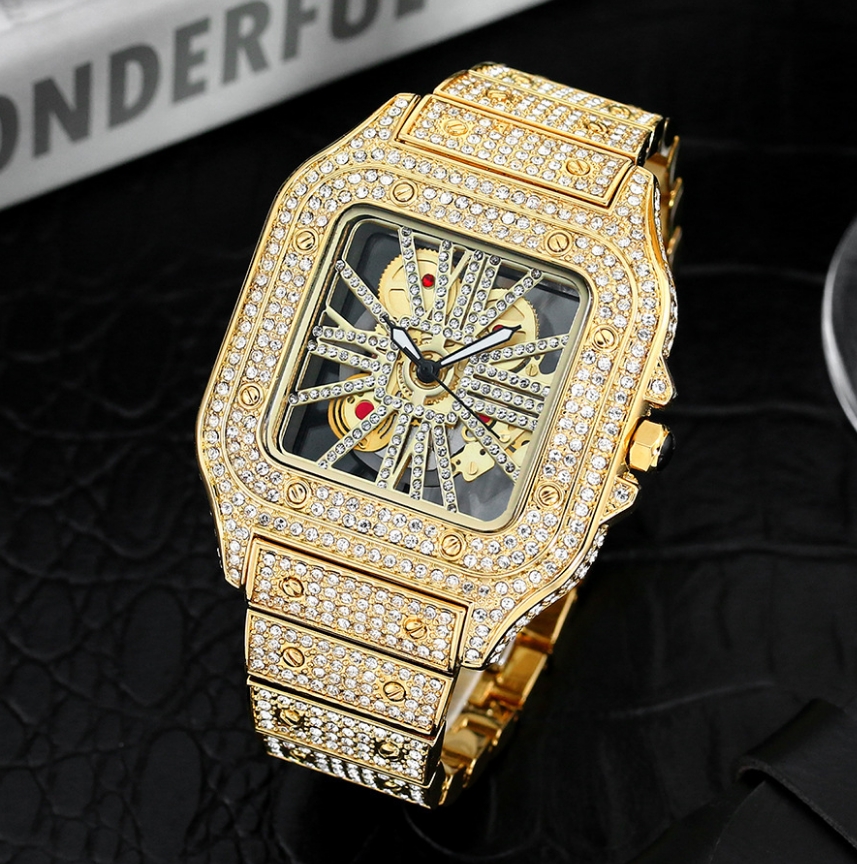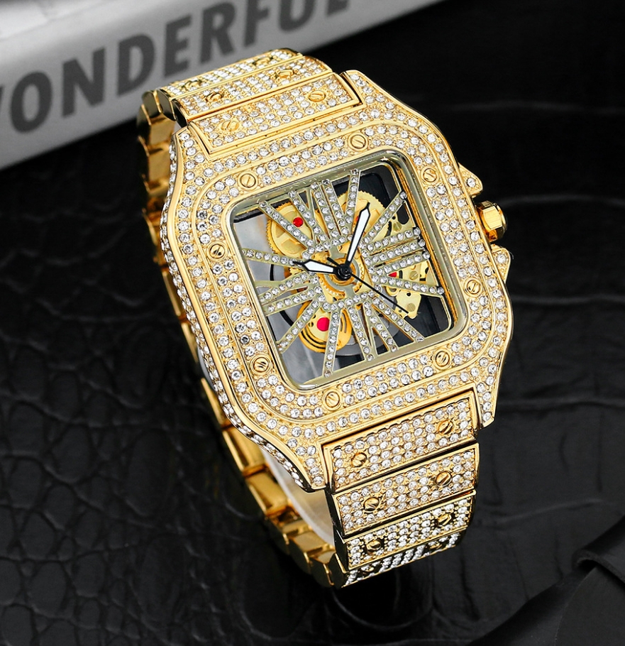 Com acabamento totalmente cravejado, mostrador vazado (hollow design) e detalhes refinados, é a escolha perfeita para quem gosta de acessórios marcantes e sofisticados.