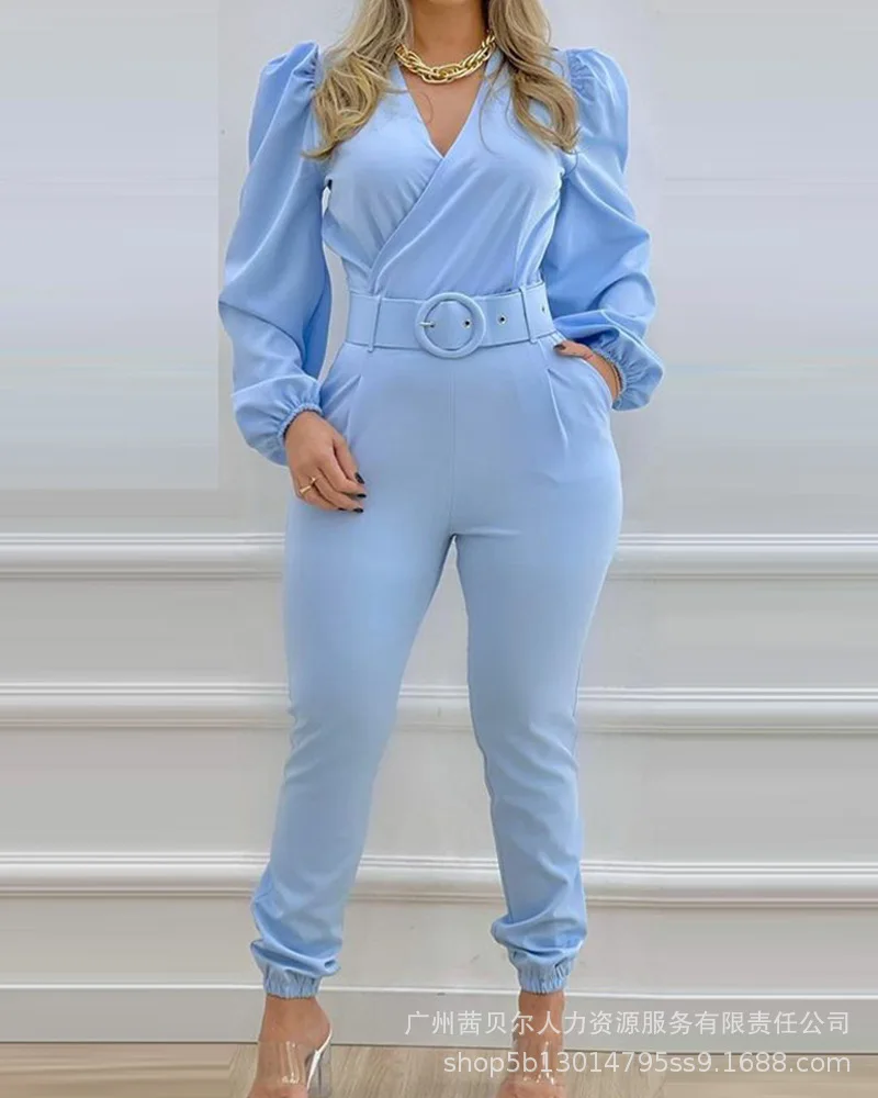 Com design moderno, mangas bufantes, decote em V e cintura alta, este macacão valoriza a silhueta e garante um visual sofisticado e casual ao mesmo tempo.