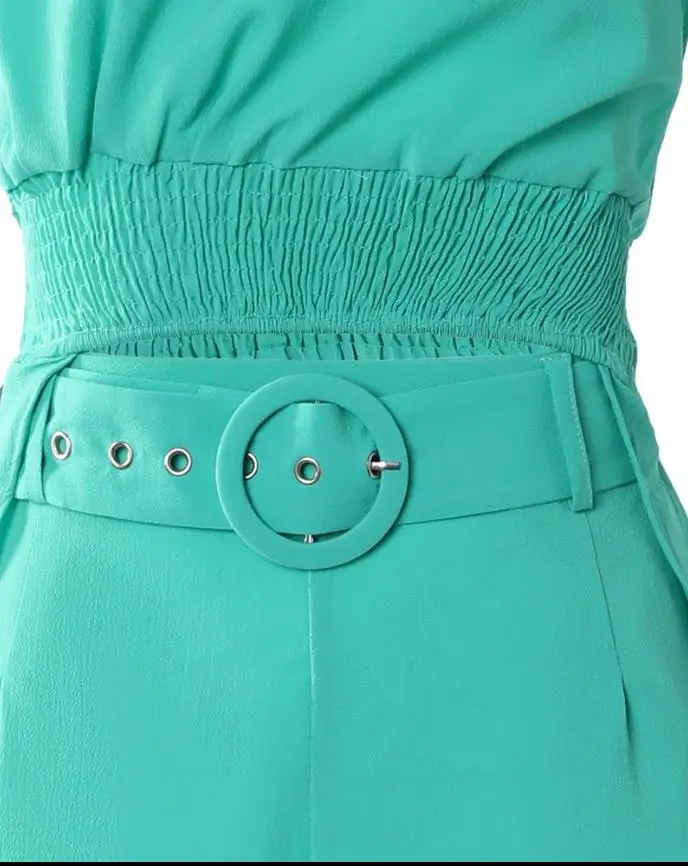 Produzido em poliéster de alta qualidade com leve elasticidade, oferece conforto, respirabilidade e ajuste perfeito. O design inclui bolsos funcionais, detalhes ruched e shirred, além de um cinto incluso que valoriza a cintura e adiciona um toque sofisticado ao conjunto.
