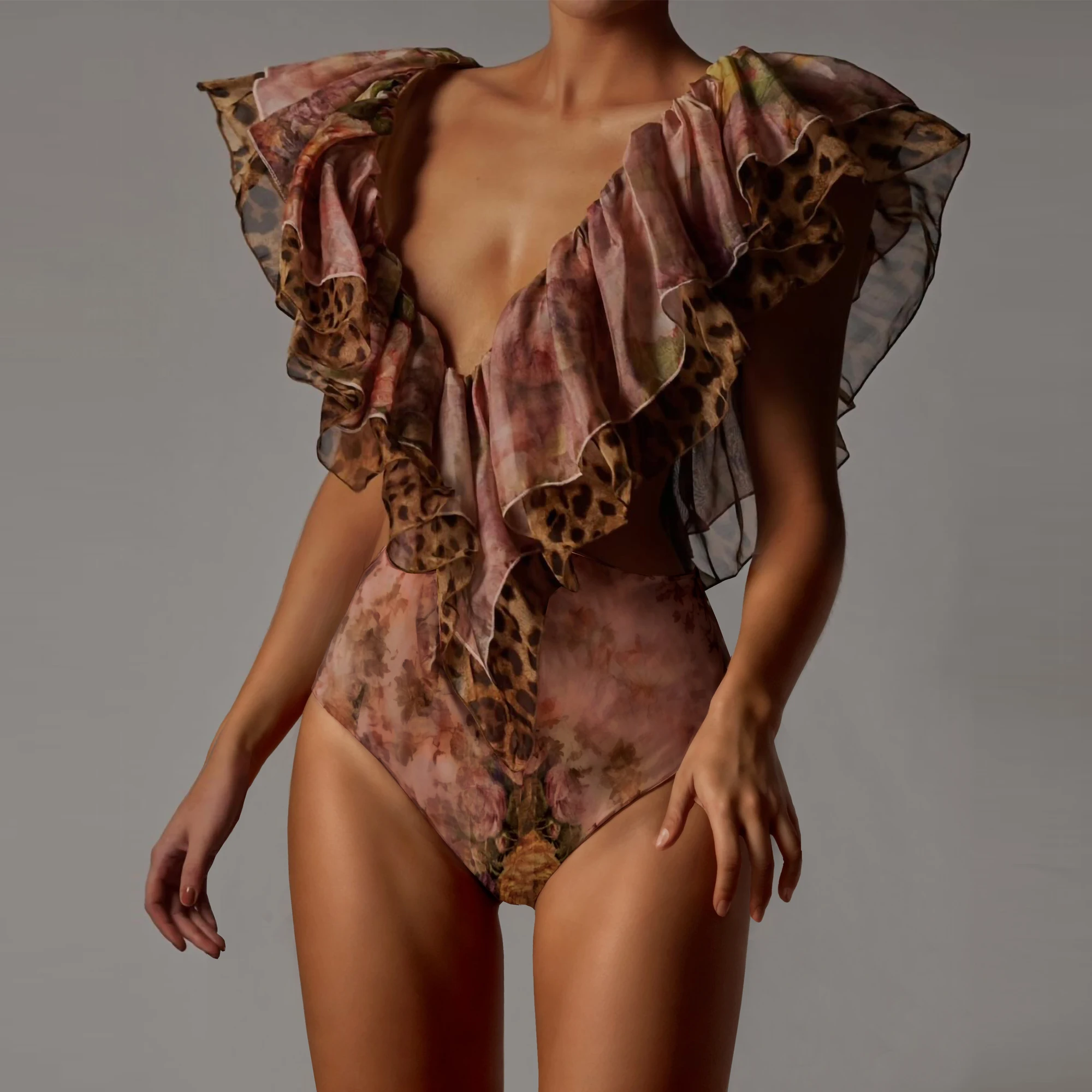 🏖️ Tendência 2025: o design com babados (ruffle swimsuit) traz charme e feminilidade ao visual de verão.